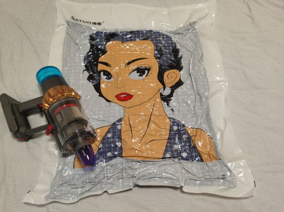 这个是真的快,一个被子,不到5秒钟就抽干净了,而且用的时候反馈特别好,戴森本身的声音就很好听,然后肉眼可见的速度,袋子一瞬间就被抽空了。一个1m多高的大抱枕,抽完真空之后跟一本书一样薄。