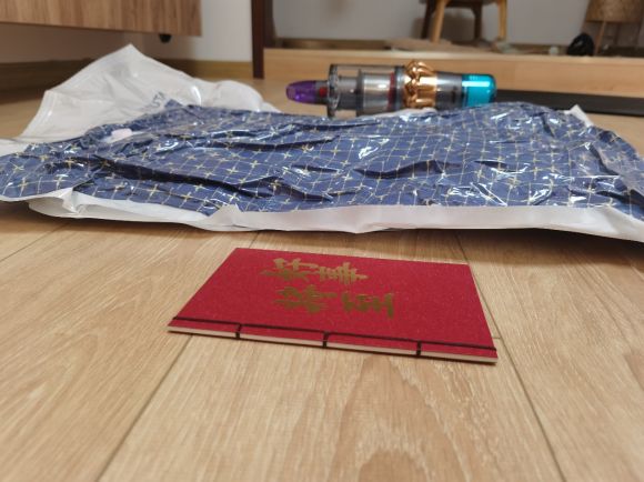打开这个礼盒,是三个配件,一套压缩袋,一个很酷的紫色配件头,还有一个朱红色的记事本,就是故宫城墙的颜色,还写着“好事将至”,爱了。
