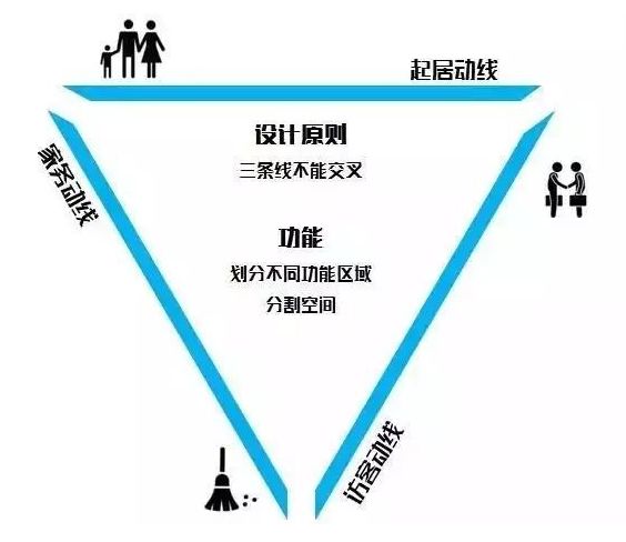 3.多条动线尽量避免交叉,如果说访客动线和居住动线交叉,那隐私感就会感觉受到侵犯;要是居住动线和家务动线交叉,那休息的时候也会嘈杂心烦;而如果家务动线和访客动线交叉,那如果有亲朋好友来玩,那聚餐也会变得手忙脚乱。所以说,我们在设计时要尽量避免动线重合,才能提升居住的方便和幸福感。