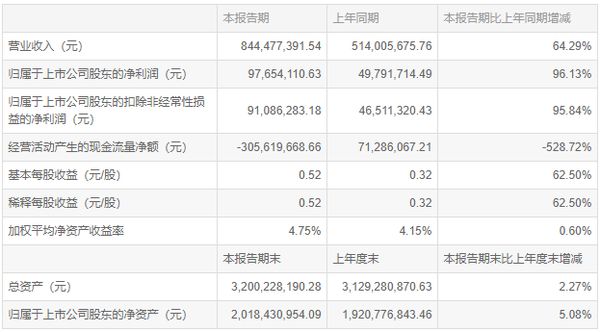 公告显示,报告期内广东皮阿诺科学艺术家居股份有限公司实现营收8.44亿元,同比增长64.29%;净利润1.03亿元,同比增长85.67%;实现归属于上市公司股东的净利润9765.41万元,同比增长96.12%;基本每股收益为0.52元;截止报告期末公司净资产为21.12亿元,与去年同期相比增长5.18%,资产负债率为34.00%。