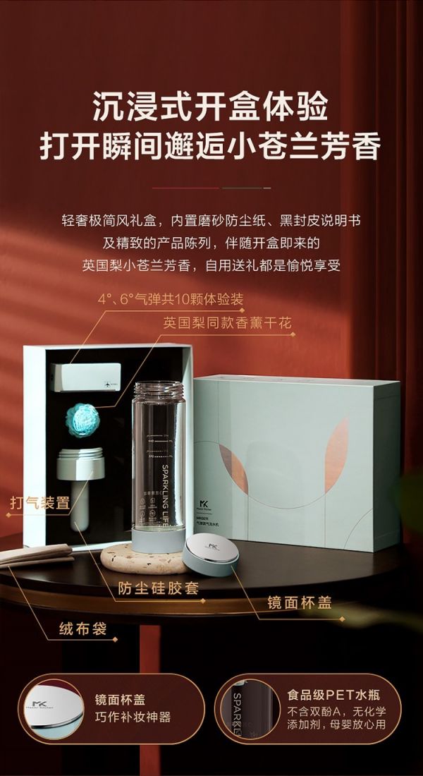 轻奢极简风的礼盒设计,沿用了Master Kitchen一贯的品味,盒内放置着磨砂防尘纸、黑色封皮说明书还有精致的产品陈列,可以说是超有腔调了!更绝的是打开盒子的同时,还伴随着英国梨同款小苍兰香薰干花的芳香,仪式感非常到位!不管是谁收到这样一份礼物,都一定能第一时间感受到送礼人的用心与细致,并带着开心和感激的心情,在日后和Master Kitchen气弹款气泡水杯的相伴中,开启健康水生活,收获满满的生活质感!