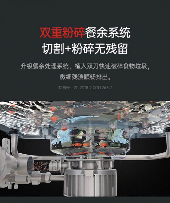 针对“餐余残渣”问题,它在技术功能上做出了全新的突破。在传统洗碗机强力的清洗技术基础上,搭载了专利双重粉碎餐余系统和专利排渣水循环系统,可以利用底部植入的双刀,将餐具清洗过程落入底部的餐余残渣快速破碎成微细残渣颗粒,然后顺着排水系统顺出,真正做到一键全自动洗碗,让用户尽享餐后休闲时光。