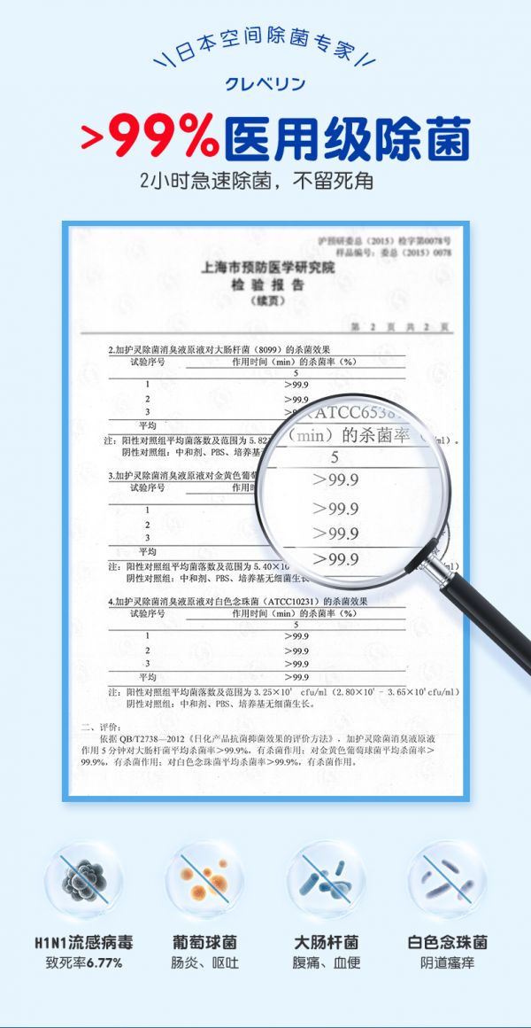 别看加护灵对人体十分安全,但对病菌,却是致命性的。它的主要成分二氧化氯对微生物细胞壁有较强的吸附穿透能力,不仅能有效地氧化细胞内含巯基的酶,还可以快速地抑制微生物蛋白质的合成来破坏微生物,抑制细菌和病毒生存并将其最终灭杀,从而有效去除浮游在空气中及附着于物体上的病毒细菌,对流感病毒H1N1和H7N9的杀灭率高达99.99%。