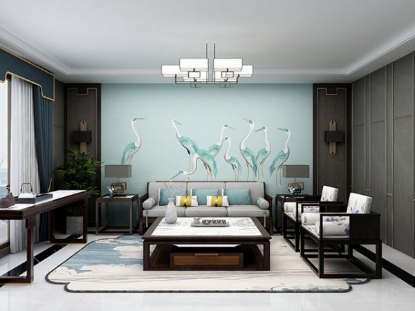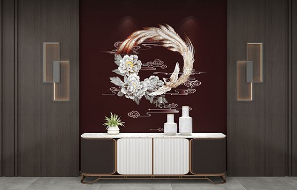乾庄用绣线描绘牡丹超凡脱俗的美,为室内空间渲染出一番华贵平和之气,绣品的肌理与光泽随着空间的光彩折射出迷人的质感,让其富有诗意和内涵。吉祥的孔雀与现代审美相结合,蕴含中国源远流长文化沉淀的艺术。庄重典雅的氛围中流露出深厚文化底蕴,给人一种涉足探步的冲动和欲望。
