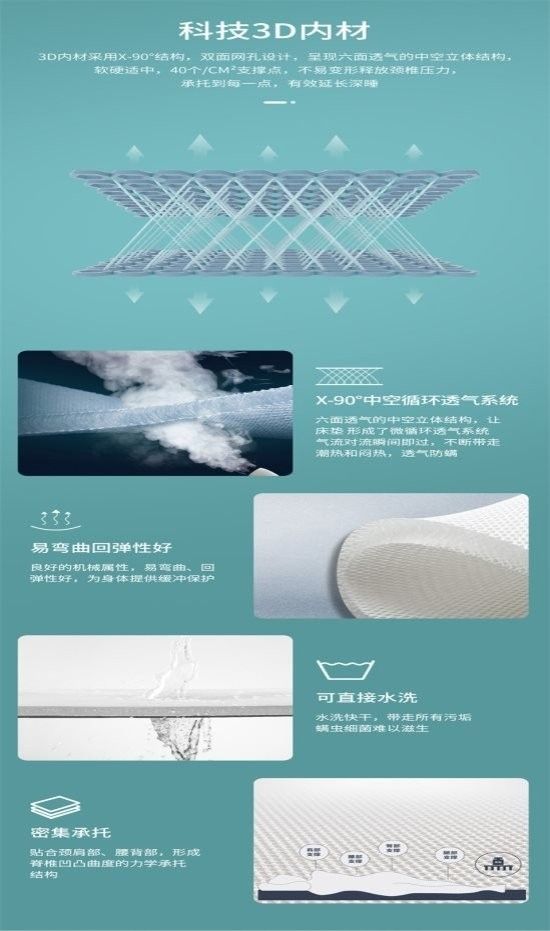 3D内材采用X-90°结构,双面网孔设计,呈现六面透气的中空立体结构,软硬适中,40个/CM²支撑点,不易变形释放颈椎压力,承托每一点,有效延长深睡。