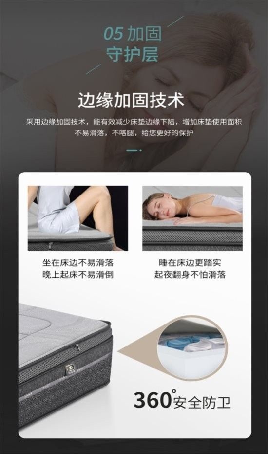 采用边缘加固技术,能有效减少床垫边缘下陷,增加床垫使用面积不易滑落,缓冲边角撞击,减少磕碰伤害,给您更好的保护。