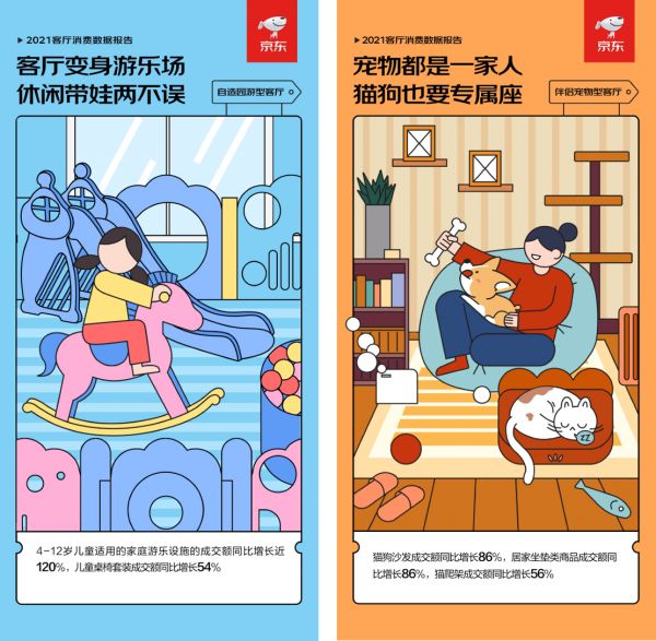京东数据显示,4-12岁儿童适用的家庭游乐设施的成交额同比增长近120%,儿童桌椅套装成交额同比增长54%,猫狗沙发成交额同比增长86%,居家坐垫类商品成交额同比增长86%,猫爬架成交额同比增长56%。