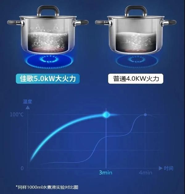 实验证明,同样煮沸1000ml水,佳歌集成灶一级能效5.0kW火力相比二级能效4.0kW火力集成灶,煮沸时间缩短了约1/4。每天早上多睡10分钟,不香吗!