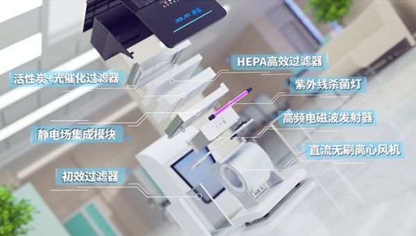 相关负责人告知笔者:如果对澳蓝这款空气消毒机进行过滤系统的拆解,那么你会发现,它使用了多级净化构造,包括初效过滤器、高频电磁波发射器、紫外线杀菌灯、静电场集成模块、活性炭+光催化过滤器以及HEPA高效过滤器。澳蓝采用的是高频发射器、高压静电集尘模块结合等离子发生器来实现颗粒污染物(病毒)的灭杀,并且在技术上已经可以做到无需更换耗材,无滤网设计,无需手动清洁,大幅减少了后期的使用成本。