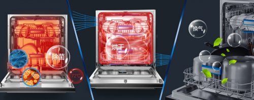 洗碗机精准解决了洗碗费时费力的痛点,只需要按照说明书把餐具正确摆放,按下开关后就能自动完成无死角冲刷。而且相比于手洗,洗碗机不仅能彻底除去餐具上残留的油腻,还能利用高温环境有效杀死大肠杆菌等常见病毒病菌,除菌率高达99.99%。