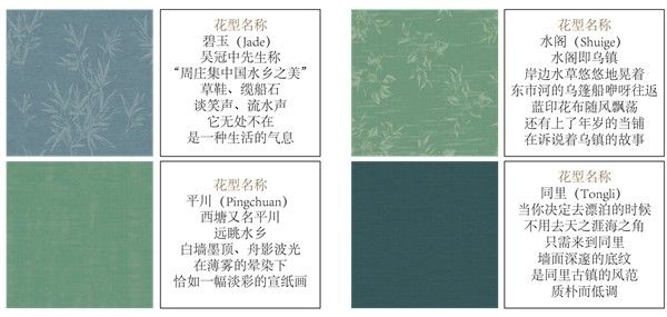 本次系列收录了碧玉、水阁、平川、同里等四种花型设计,在中国古镇中汲取设计灵感,打造出江南温情。