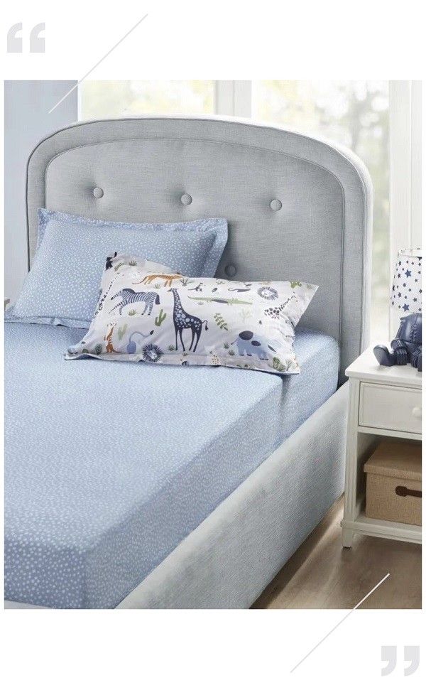 该款床品也搭配了独立的儿童床笠, 不规则点状纹样落于床铺,清新耐看。它使用的是T300全棉缎纹布,细腻柔软,贡缎织造的工艺亦使得布料表面富有了光泽感,是陪伴孩童入睡的一款上乘之选。