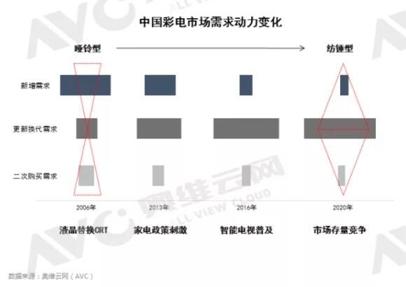 其实在以前,我国彩电行业高速发展,整个彩电市场的增长以“新增需求”为主,其次是“更新换代需求”,占比最小的是“二次购买需求”。