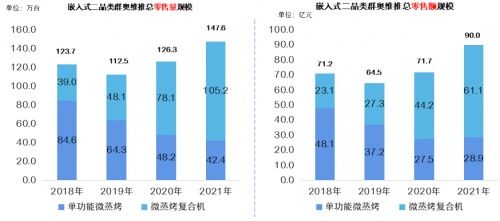 传统美食文化复兴、健康意识崛起、快节奏时代以及中国家庭消费升级等诸多因素的影响,促使厨房电器逐渐朝着集成化、一体化的方向发展,并走向家电市场的主流舞台。根据奥维云网年度数据,2021年预计嵌入式二品类群零售量规模147.6万台,规模90亿元,并且在精装修市场,2021’H1一体机配套项目规模同比上升159.7%,精装修市场蒸烤一体机颇具发展空间,具备极强的增长韧性。