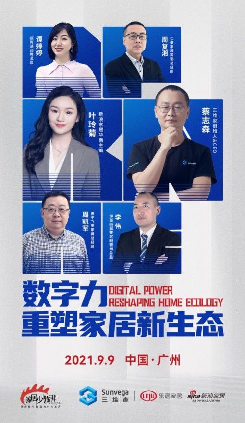 2021年9月9日,新浪家居华南主编叶玲菊对话三维家创始人&CEO蔡志森、德中飞美家具总经理周凯军、皮阿诺品牌总监谭婷婷、仁豪家居营销总经理周复湘、伊百丽轻奢定制销售总监李伟,就家居企业如何拥抱数字化浪潮、家居企业在数字化转型中面临哪些问题、家居业数字化未来有怎样的想象空间等热点话题进行了深度交流。