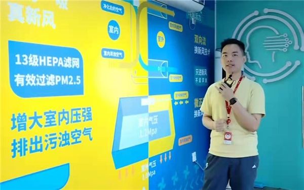 在活动现场的“新风实验室”密闭空间内,工作人员布置了新风空调、蚊香、二氧化碳测试仪等,打开新风空调后,实验室内的二氧化碳浓度明显下降,空气质量迅速改善。通过新风系统的加持,可以将室外的新鲜空气经过过滤之后导入室内,既阻隔了室外污浊的空气,保证了室内的恒温恒湿环境,也能随时进行室内外空气的交换,有效降低因为房间密闭性与空气流动性较差而产生的空调病问题。