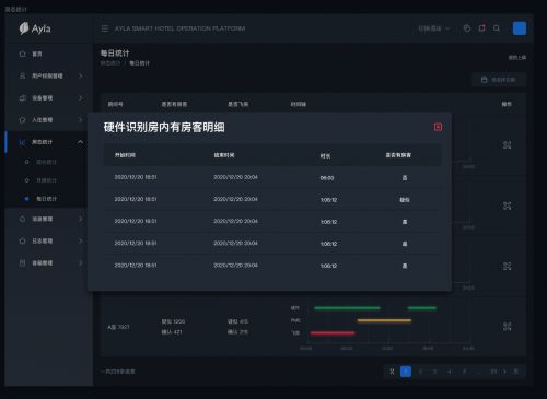 该飞房预警功能依托智能硬件、可视化SaaS、PMS、酒店管理小程序等智慧酒店管理功能模块,通过客房内智能取电开关或者门磁+人体存在传感器作为入口,收集设备使用时长等数据,通过准确记录房间有人、无人状况和能耗等数据,可以分时、分类查看数据。