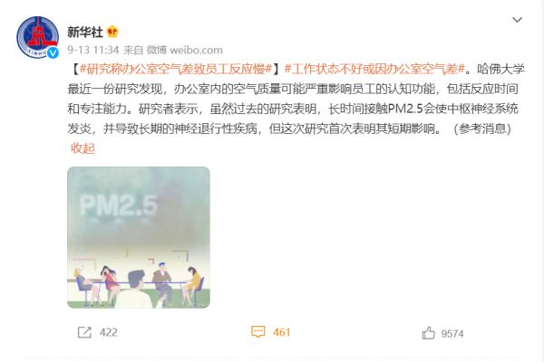当你出现工作效率低、工作质量差、经常被领导批评等类似情况时,你可能习惯性认为这是工作太累,工作能力下降导致的。除此之外,你有没有考虑过还可能是因为办公室空气质量太差了?美国哈佛大学最近研究发现,办公室空气质量会严重影响员工的认知功能,包括反应时间和专注能力,进而会影响到工作效率。