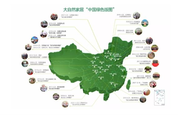 大自然坚持15年公益植树,截止2021年,大自然在中国绿色版图中的18个地区,种植26片生态林,公益植树超过81万棵,植树面积超过106万平方米。