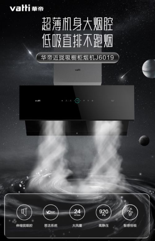 华帝近拢吸橱柜烟机J6019采用创新拢烟腔外推结构,日常关闭“隐”于橱柜,释放厨房空间;超薄机身设计,伸缩拢烟腔,顺势直吸更强劲,爆炒风量高达24m³/min,常规风量噪音低至50db,整体造型既动感又独具个性魅力。另外,J6109还配有手势智能控制和V-Clean智洁系统,挥手感应,瞬吸油烟,并且操作更便捷。