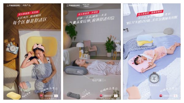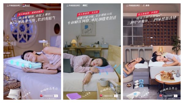 天猫家居联合六个品牌对枕头品类进行了深度研究。通过真实有效的市场调研和消费大数据,提炼出“无压枕、超柔助眠枕、护颈枕”3大趋势,帮助消费者建立认知,满足不同睡感需求。同时以产品昵称的形式,展开产品传播。