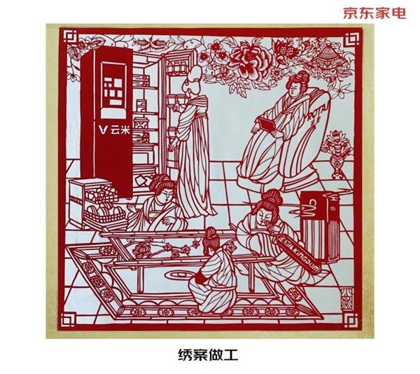 这些穿越剪纸作品是由京东家电与非物质文化遗产传承人、剪纸大师陈小燕合作推出的,描述了国潮风兴起后,新国潮家电在多种生活场景中给人带来健康、舒适体验的景象。借用南唐画家顾闳中的《韩熙载夜宴图》、唐代画家张萱的《捣练图》、元代刘贯道的《消夏图》等古代经典名作,将美的、海尔、格力、小米、科沃斯等国内家电品牌的新风空调、洗衣机、洗地机、空气净化器等新兴国潮家电与古典生活做融合统一。古代朋友欢聚有现代电火锅,炎炎夏日有新风空调,唐代仕女与朋友交换美容仪的使用心得。
