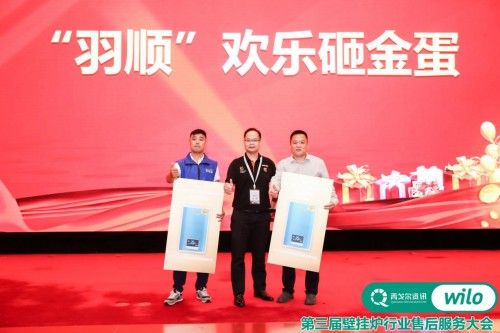 在欢乐砸金蛋环节,羽顺热能市场部经理资军为大会抽奖嘉宾上台抽取幸运观众并颁发奖品,羽顺热能作为第三届壁挂炉行业售后服务大会赞助商,为本次大会带来丰盛的大礼包。