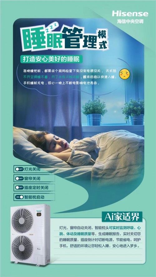 比如,你是个前卫的年轻人,对新鲜事物很感兴趣,喜欢通过智能设备让自己的生活变得简单便捷。那你可以了解一下海信中央空调Ai家系列产品,它有睡眠管理模式、极致观影模式、回家即享模式等一系列智能场景。以睡眠管理模式为例,只需通过一键设置,就可以实现自动关闭灯光、窗帘,空调温度设置,以及定时切断电源,让你可以安心入眠。
