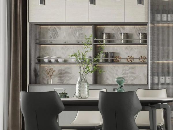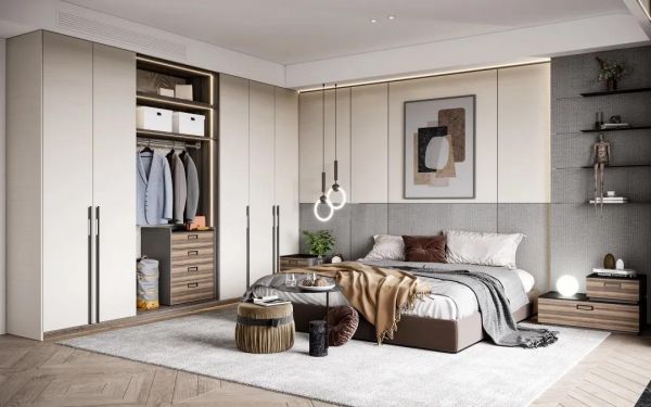 “新尚流云”通过对不同空间的巧妙设计,做到全屋风格统一,缔造了无压、自然的生活场景。比如一字型的入户柜简洁大方,内部有着科学分区,既体现了简约美,又具备强大的收纳能力。餐厅柜集储物、展示、备餐于一体,整体大气美观,亲近自然。卧室的设计则是充分利用了每一寸空间,柔和的色调加上带有自然纹理的衣柜,营造出自然温馨的氛围。