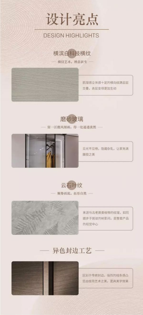 除了具有自然气息的材质与色调外,该系列产品还都采用到顶设计,并对内部空间进行了细致的分区规划,满足不同收纳、储物需求。柜身搭配大面积自然木质纹理,呈现出亲近自然的整体风格,符合现代极简生活的特征。