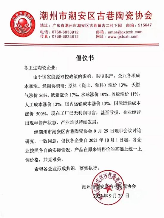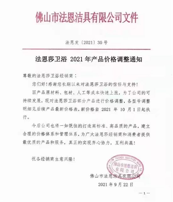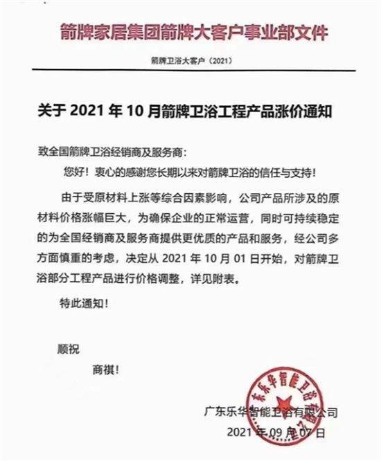 原材料价格上涨叠加限电,几百家家居企业全线涨价!箭牌、东鹏、法恩莎等多家卫浴企业发布涨价涵!