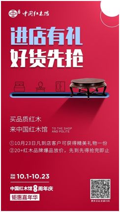 中国红木馆八周年庆10月1日正式起航,活动将持续至10月23日。本次活动以女性为中心打造了多个家居购物场景,设置了多重惊喜礼品: