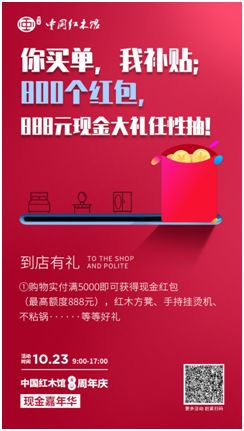 有爆品、有礼品还不够。这次中国红木馆八周年庆还在现金嘉年华中准备了800个红包(最高额度在888元)和红木凳、挂烫机等礼品回馈消费者!只要消费者实付满5000元即可参加现金嘉年华10月23日的抽奖活动!