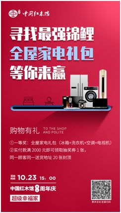 中国红木馆八周年庆——超级幸福家活动,我们为所有消费者准备了全屋家电大礼包,其中包含空调、冰箱、洗衣机、电视机。让消费者在这个十月,在中国红木馆一次性配齐所有家装!当然超级大礼只有一份,消费者在活动期间消费实付满2000元即可参加!数量有限,先到先得!