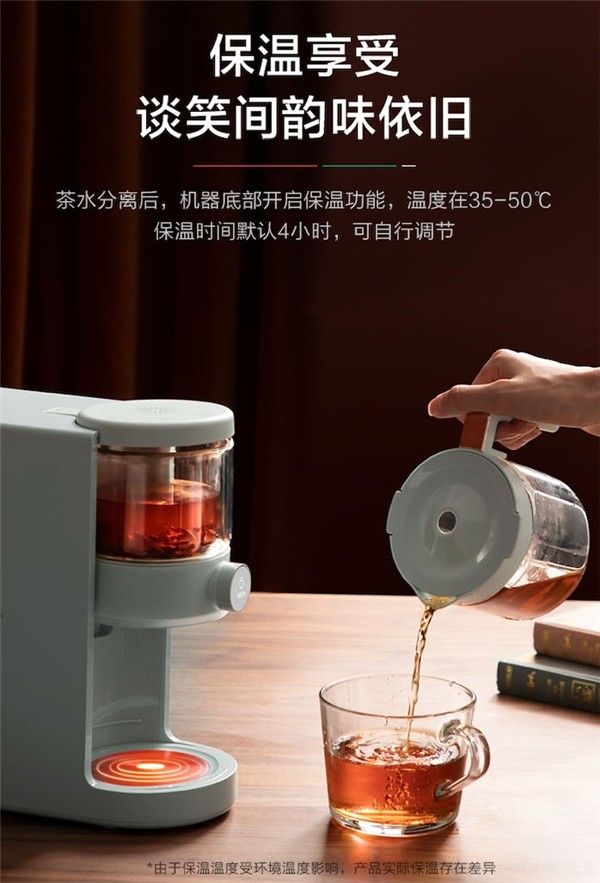 茶水分离后,机器底部会自动开启恒定保温功能,默认4小时的保温时长,让你在工作过程中,无论何时都可享受一口温度适宜的茶饮,同时,你还可以自行调节Master Kitchen冲泡大师的保温时长,臻享私人订制般的茶饮体验。