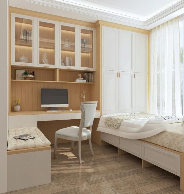 除了一体式榻榻米,还可以选择衣柜+延伸书桌这一卧室最佳“CP”。在定制衣柜末端连接床头的位置,延伸出一张书桌,不仅可以作为梳妆台、床头柜,也可以作为简单办公阅读的学习区。一举两得~