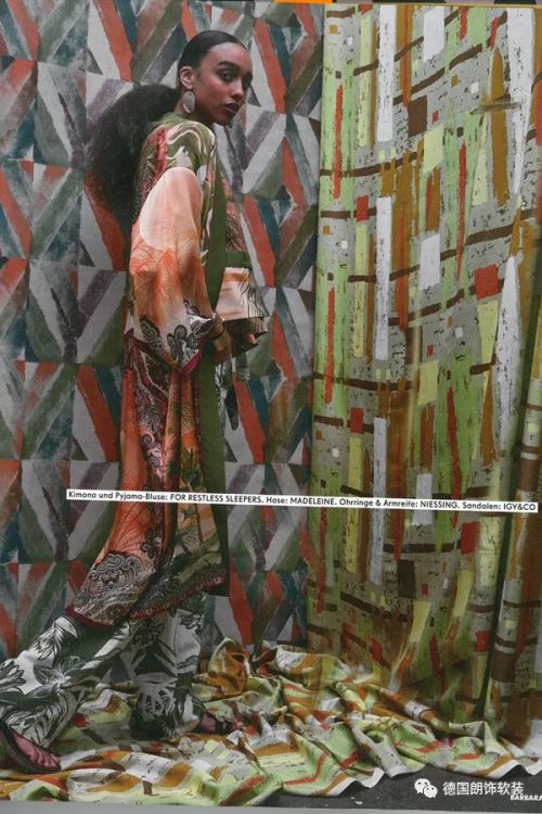 非洲的美丽风情和民族自豪感完美地呈现, 模特身穿同色系睡衣,鲜艳色彩和谐地融入非洲纺织画作中, 打造时尚、轻松舒适的居家环境。
