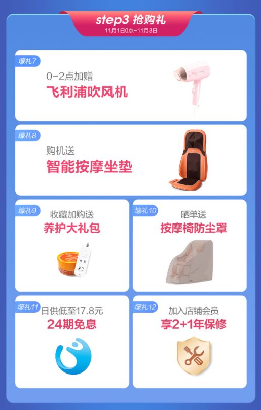 第三阶段11月1日抢购正式开始!0点至2点开售,前两小时下单可额外获得“飞利浦吹风机”的限时抢购礼。抢购期间凡参与购机,即可获得“智能按摩坐垫”来给你的生活加点“小料”。购机即享24期免息,日供低至17.5,实现“按摩椅自由”不再是梦。购机同时收藏加购,并加入店铺会员“一键三连”,按摩椅养护大礼包以及会员专享的2+1年质保也就“顺便”加入了你的礼包清单。最后来个晒单结尾,还有按摩椅防尘套送到你家!