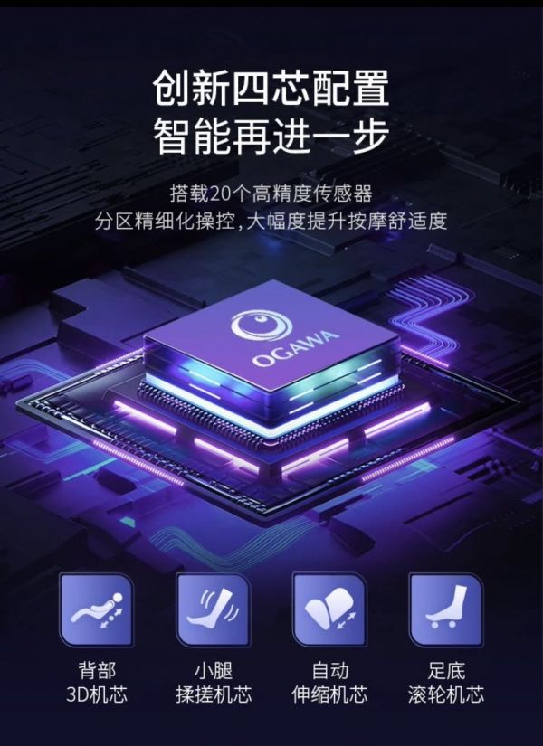 初见送礼,“礼节”做到位,是“郑重”更是“珍重”。奥佳华“为舒适而生”的OG7806不但懂礼,更“有情有义有实力”。本次选用的创新“四芯配置”,共搭载了20个高精度传感器,分布在背部3D机芯、小腿的搓揉机芯、足底滚轮机芯,以及腿部自动伸缩机芯,对疲劳“重灾部位”分区精细化“对症”按摩,智能更进一步,舒适度更高一层。