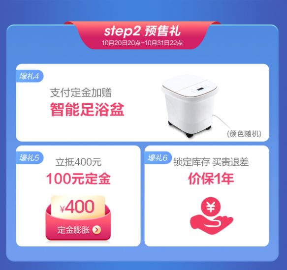 第二阶段从10月20日至10月31日期间,用100元参与预售,即刻抵扣400元,让定金膨胀、福利“长胖”,同时加送泡脚神器“智能足浴盆”,以及“保价1年”的隐藏惊喜!