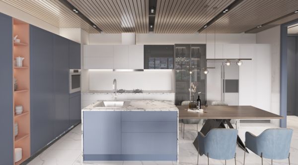 不同于一般餐厨强调实用性。柏厨“醉花间Ⅱ”餐厨空间分为简餐区和中餐区,兼具设计感和美观性。简餐区设置小家电操作区和岛台,集简餐制作、小家电操作与美食品尝互动于一体,增加美食创作者与品尝者的互动,是茶米油盐也是你侬我侬。中餐区根据中餐制作的人体动线划分区域,设置洗涤区、操作区、烹饪区、食品储存区以及餐具储存区,操作流畅,减少移动距离,也缩短人与人间的距离。现代轻奢风格的产品,增强了美食的色泽,使得美食更加的诱人,在餐桌上摆上石景和绿植,让餐厅的空间就像是田林一样自然生机,长长的餐桌让一家三口在这里享用美食实在是太享受了。
