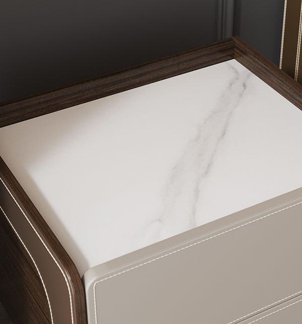 月影岩板床头柜可与上述意式轻奢风格的皮艺床组合搭配,为卧室的角落增添一抹亮色。雪花白岩板不仅时尚百搭,而且容易清洁打理。用马鞍皮围边,美观大方,彰显质感。具有光泽感的五金脚,稳固承重性强。