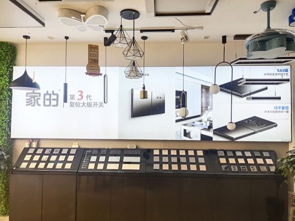 家的实体店软膜灯箱展示屏,设计风格大气、美观,在灯光的照耀下,格外地醒目。它充分地展示第3代复位大板开关的魅力,吸引行人驻足观看。进到实体店里的消费者,咨询有关第3代复位大板开关的信息,并仔细端详,体验手感。