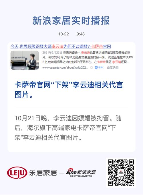 【家电快讯】10月21日晚,李云迪因嫖娼被警方通报。随后,海尔旗下高端家电卡萨帝官网“下架”李云迪相关代言图片。