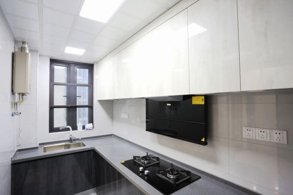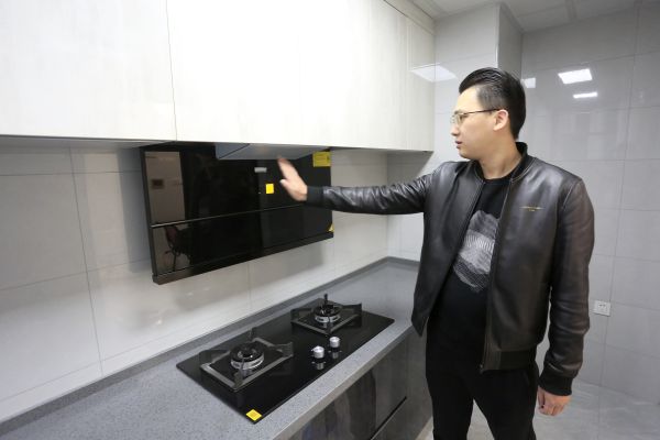 【▲厨卫装饰选材很“前卫”】房东是很个容易接受新鲜事物的中老年人,厨卫部分的装饰用材也非常前卫,设计师将“黑白灰”三色运用得得心应手。橱柜台面采用深灰色石英石,平常酱油、醋渍洒在上面不易渗透,看起来也不明显,便于老人清洁。除此之外,还有一个宝藏家电产品让人眼前一亮——方太的分体式油烟机,只需手在油烟机前面轻轻一挥,就可以实现无接触式开关,为老人提供了更便捷的操作手法。