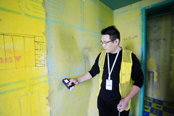 【▲墙体改造施工更精细】砌墙工艺方面,山水人家的新砌墙体与老墙体之间首先要拉毛10公分左右,我们在现场看到,所有新砌的墙体都用防裂纤维网铺贴后进行粉刷,若后期新砌的墙体受热胀冷缩的影响出现沉降状况,就可减少开裂的几率,所有新墙与老墙之间还会植入钢筋,用钢筋来承重,防止后期墙体开裂变形,上图正是监理在用钢筋测试仪进行检测。