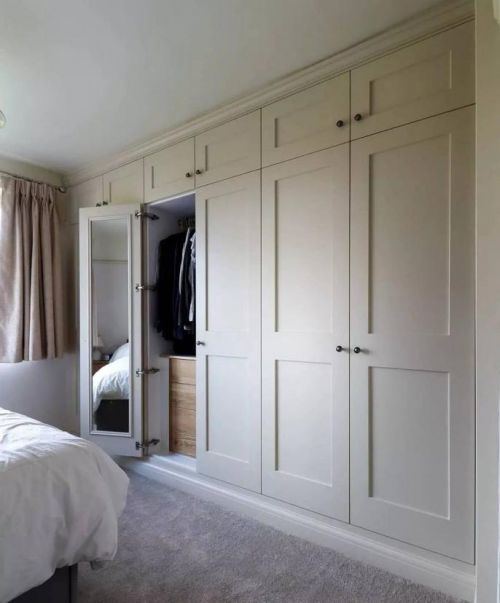 所以,要尽量减少不必要的家具,可以设计一体式衣柜、书架,将它们放进墙体之中。一体式家具的另外一个好处就是使卧室更协调,增加美观度。