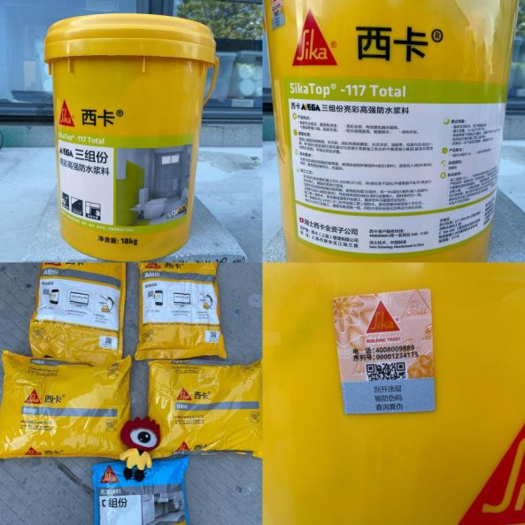 (西卡三组份防水浆料,内含A组份*2,B组份*2,C组份*1;产品说明、防伪码清晰可见。)