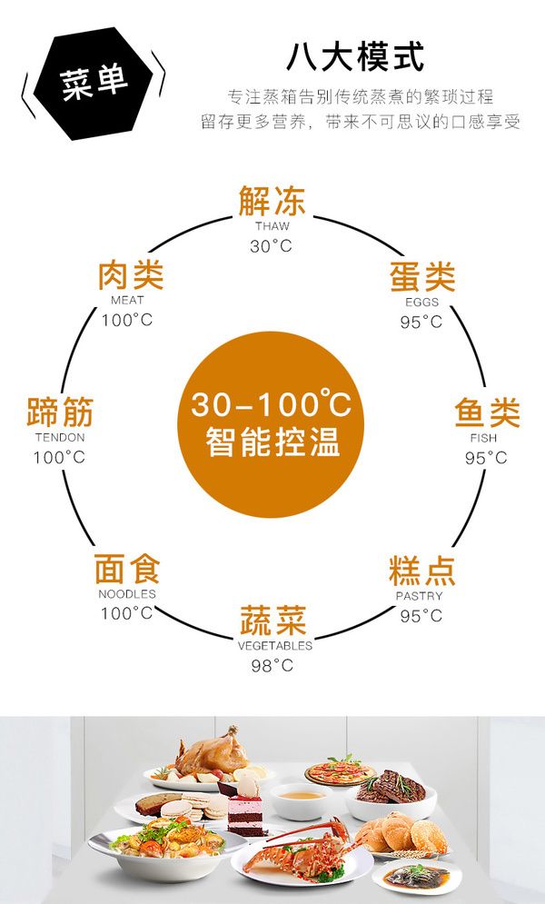 蒸对于火候、时间的要求是非常精准的,不同食材,蒸的手法差异很大,优格G19Z内置八大烹饪模式。我们只需将处理好的食材放入蒸箱,就能坐享美味食物的诞生,何乐而不为?