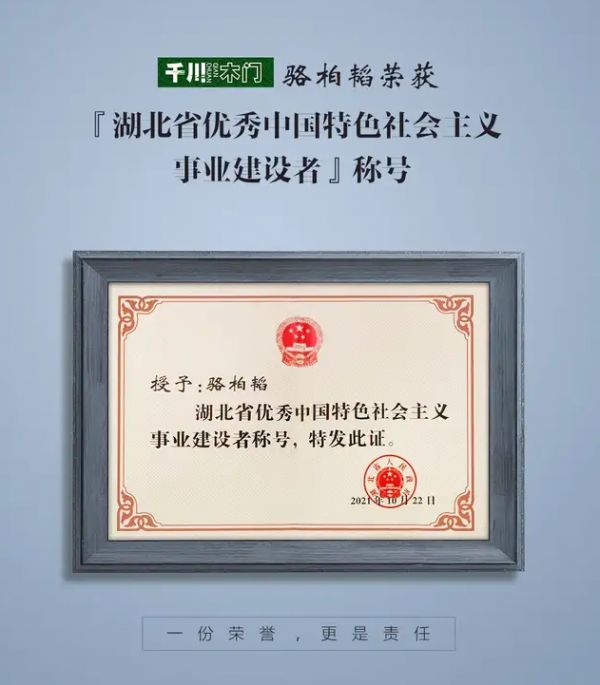 会上隆重表彰了湖北省优秀中国特色社会主义事业建设者100名,其中,民营经济人士90名,其他新的社会阶层人士10名。各行业人士积极投身新时代中国特色社会主义伟大事业,推进湖北高质量发展,在坚持改革开放、推动经济发展、拓宽就业渠道、促进社会和谐、助力脱贫攻坚、参与疫情防控等。在此次评选中千川木门董事长骆柏韬荣获“湖北省优秀中国特色社会主义事业建设者”称号。